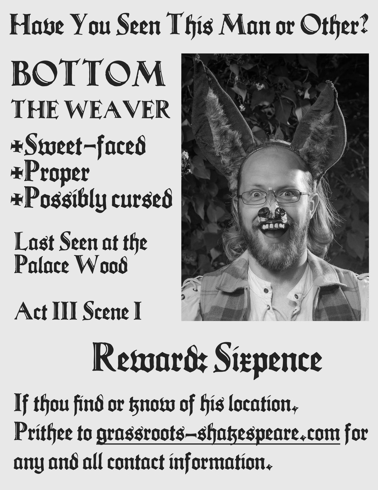 Much like Bottom the Weaver, Steven Pond wants to play every role. And by golly he's almost got it. Having started with Grassroots back in 2012 he's now been a monster (Caliban), a prince (Hal), a clown (Touchstone), a king (Macbeth), a steward (Malvolio), a Roman (Julius Caesar), and finally typecast as an ass. Hardly even have to act for this one! When he's not eating, drinking, and breathing Shakespeare, Steve can be found obsessively researching Brandon Sanderson for his YouTube channel (https://www.youtube.com/@TheCosmerenaut), building up his fledgeling Voice Over business (https://stevenpondvoice.wixsite.com/welcome), or playing with his wife and two boys (one of whom had his own Shakespearean debut the last time we did Henry V!) Please pardon his welsh accent for not actually being a welsh accent. They're hard.